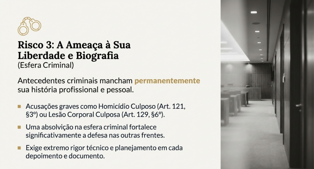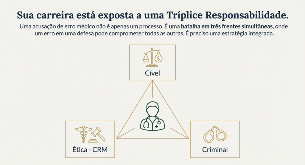 Sem uma defesa técnica robusta, você fica exposto à chamada “tríplice responsabilidade”. Isso significa responder simultaneamente nas esferas cível, ética e criminal. Cada uma dessas frentes possui regras próprias, prazos diferentes e consequências específicas.