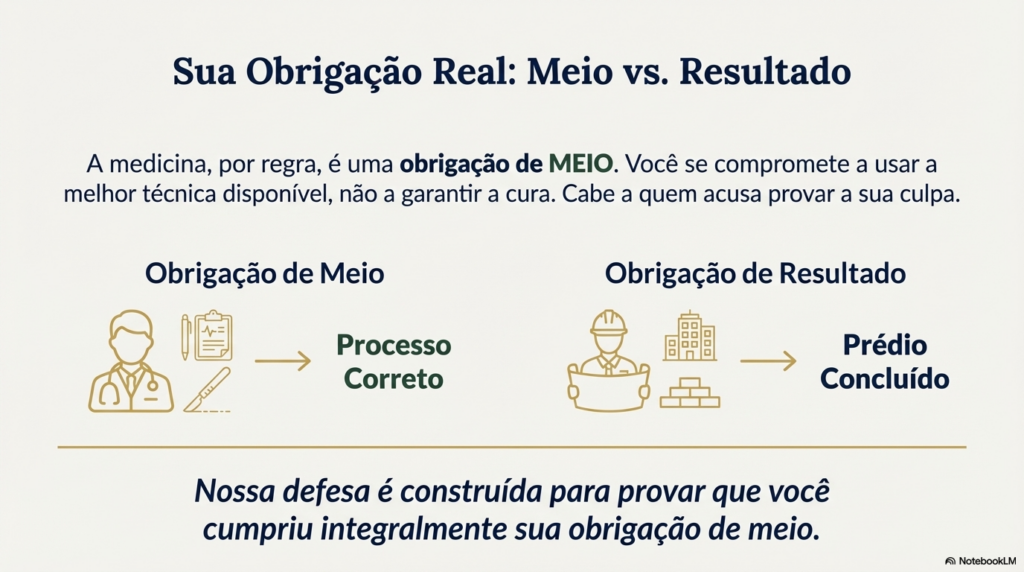 O Direito brasileiro classifica as obrigações profissionais em duas categorias: de meio e de resultado. Essa distinção é fundamental para entender a responsabilidade médica.
