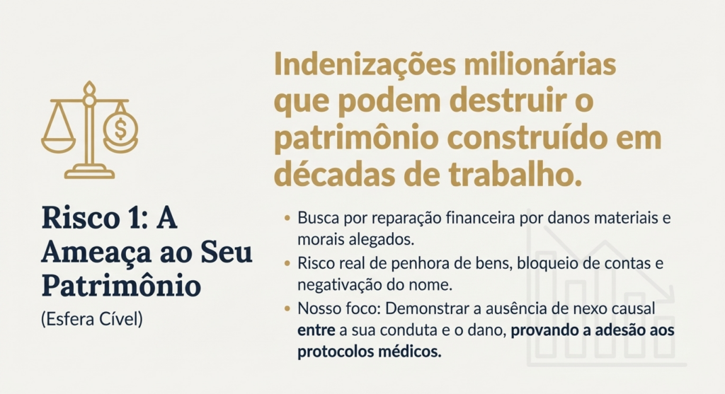 O problema é que muitos juízes, sensibilizados pelo sofrimento da família, tendem a presumir culpa do médico. Consequentemente, sem uma defesa técnica sólida, você pode perder o patrimônio construído ao longo de décadas de trabalho.