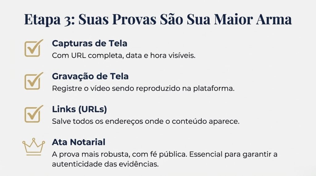 Se possível, registre uma ata notarial em cartório. Esse documento tem fé pública e garante a autenticidade das provas. Embora tenha um custo, a ata notarial é a forma mais segura de preservar evidências digitais.