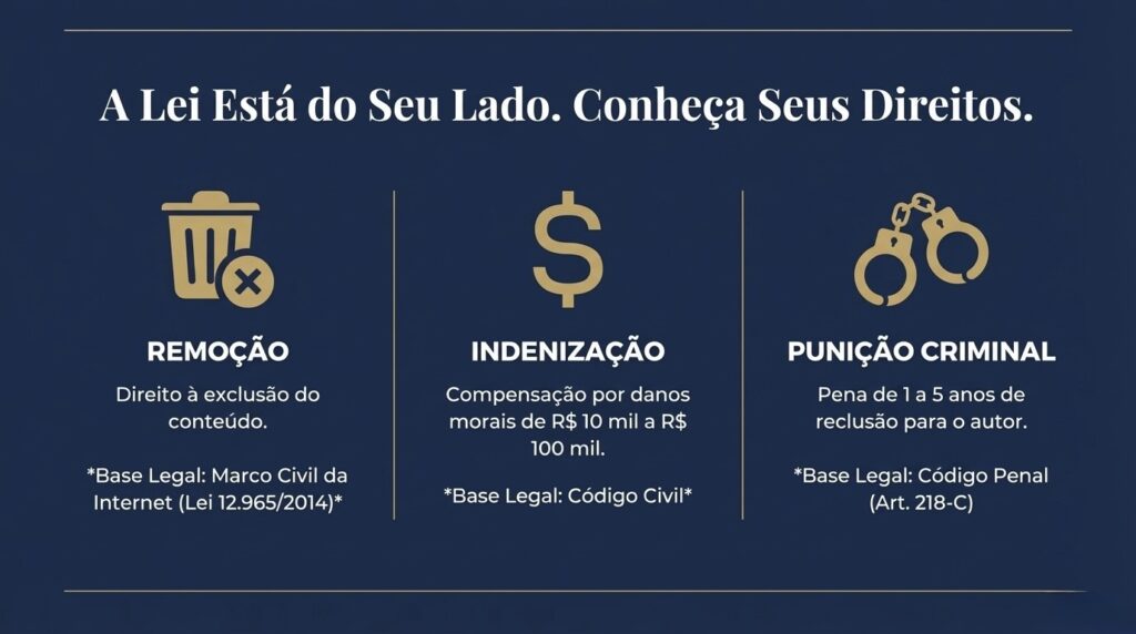 Além da remoção, você tem direito a uma compensação financeira. O Código Civil brasileiro prevê indenização por danos morais quando há violação à honra, imagem ou privacidade.