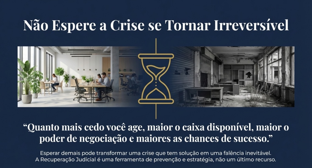 O segredo está em agir rápido. Quanto mais cedo você buscar ajuda, maiores as chances de sucesso. Esperar demais pode transformar uma crise reversível em falência inevitável.