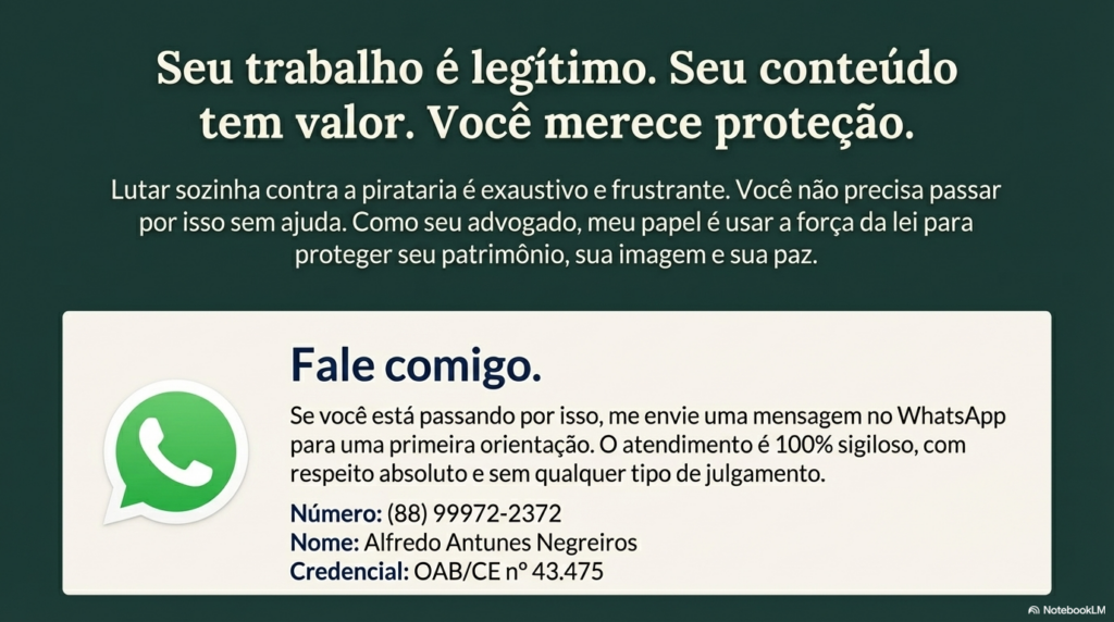 Eu sou o advogado Alfredo Antunes Negreiros (OAB/CE nº 43.475) e já ajudei diversas criadoras de conteúdo a tirar material pirateado do ar, identificar quem vazou e recuperar financeiramente o que perderam. Atendo com sigilo absoluto, respeito e sem qualquer julgamento.