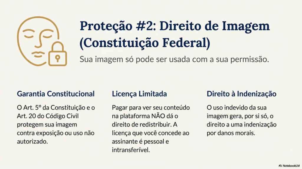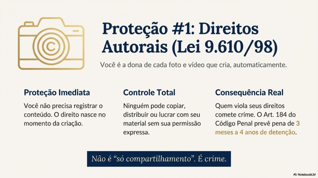 A boa notícia é que a lei brasileira protege você. Como produtora de conteúdo, você é titular dos direitos autorais sobre cada foto e vídeo que cria. Isso significa que você pode exigir a remoção do material, processar os responsáveis e até recuperar financeiramente o que perdeu.