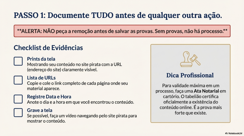 Esse passo é crucial. Se você pedir a remoção antes de guardar as provas, o site pode tirar do ar e você ficará sem evidências para processar depois. Portanto, documente primeiro.
