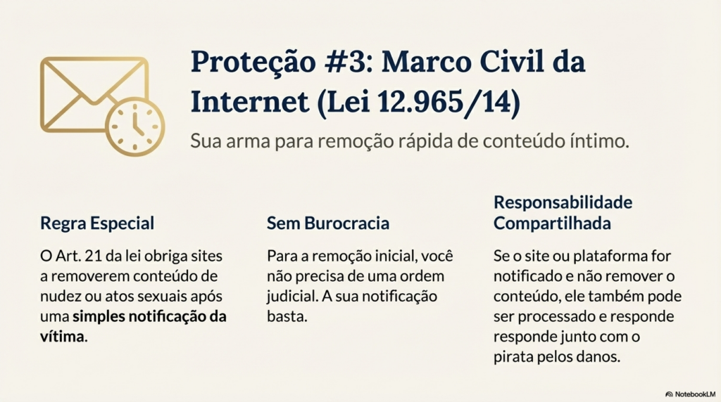 O artigo 21 do Marco Civil da Internet (Lei 12.965/2014) criou uma regra especial para conteúdos de nudez ou atos sexuais. Diferente de outros casos, os sites são obrigados a remover esse tipo de material após simples notificação da vítima.