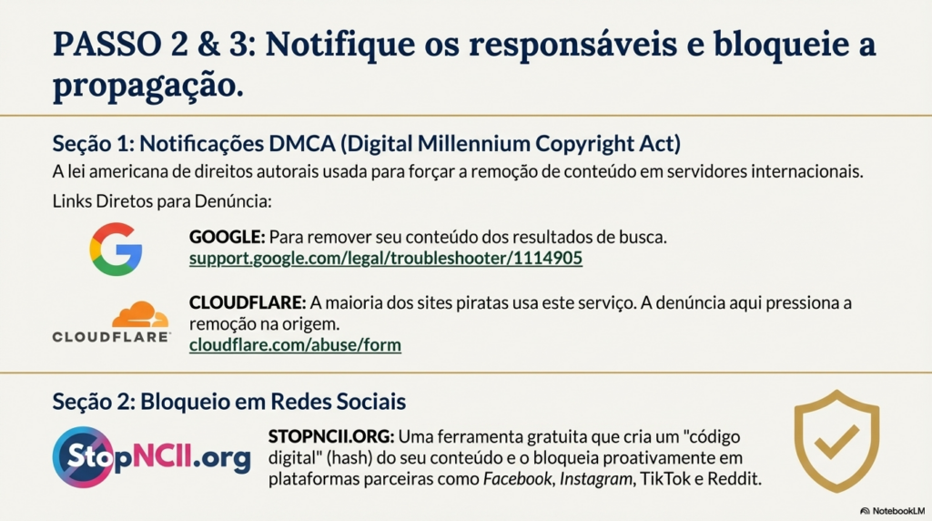 🔗 PASSO 2: Envie notificações de remoção (DMCA/Takedown)
