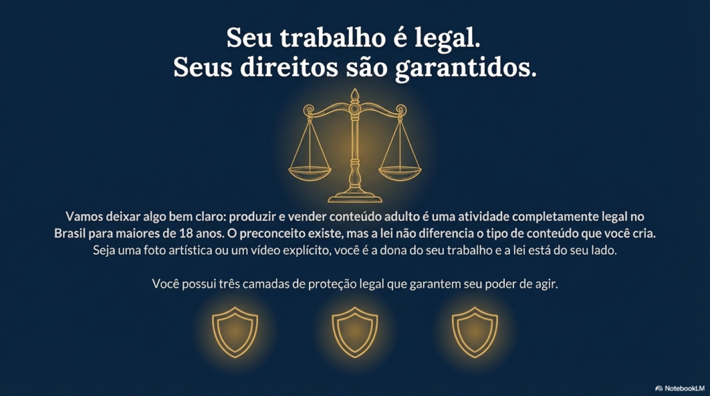 Vamos deixar uma coisa bem clara desde o início: produzir e vender conteúdo adulto é completamente legal no Brasil. Você não está fazendo nada errado. O que é crime é a distribuição não autorizada do seu material por terceiros.